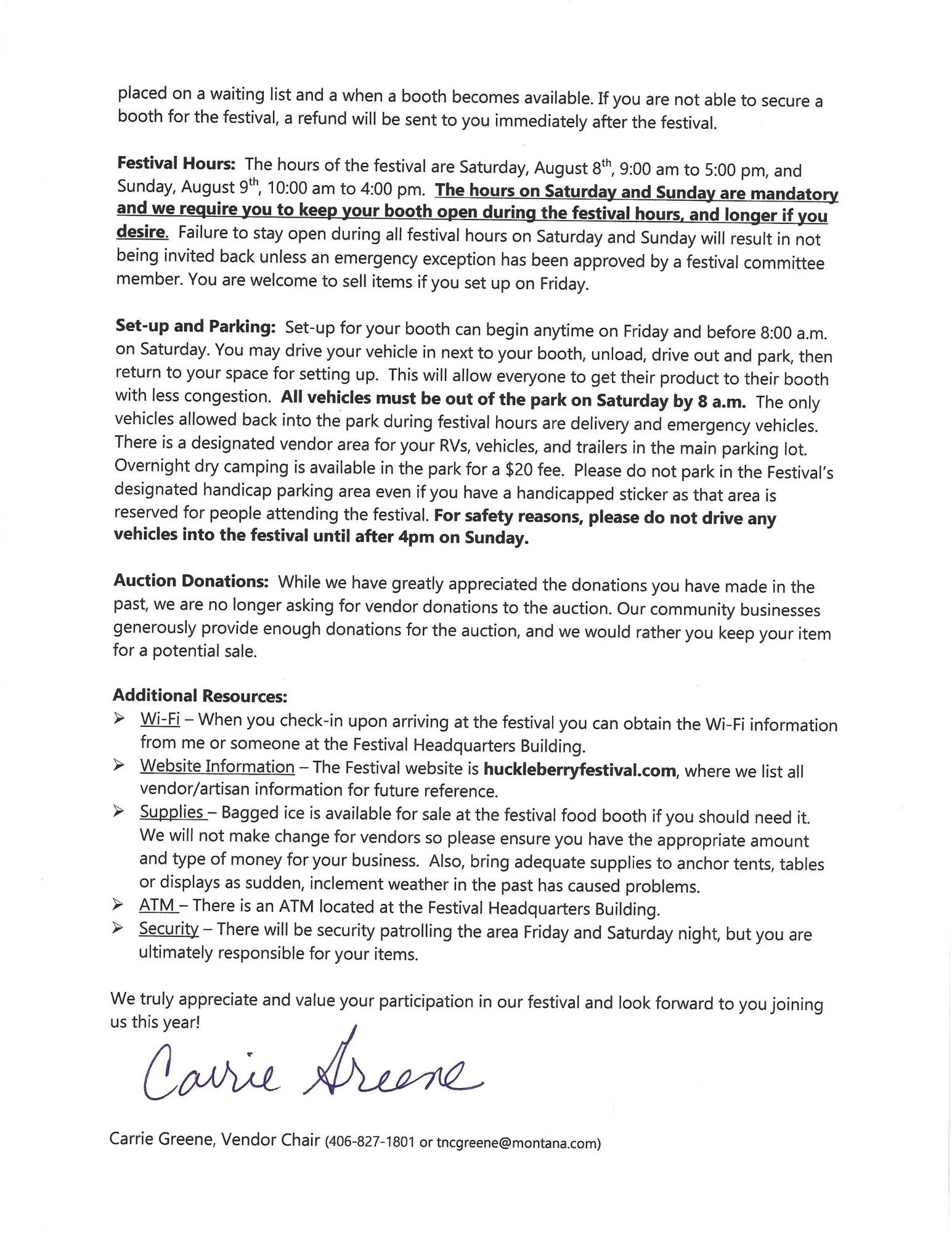 We also have several food vendors, staffed by various charitable and civic groups in our communities, and serve as an important fundraiser for those groups. So as not to compete with our non-profit groups, we do not accept commercial, for-profit food vendors. It is the responsibility of the non-profit group to obtain a food handler permit from the county (information can be found HERE). If you are a non-profit group interested in becoming a food vendor at the festival, please contact Carrie Greene at tncgreene@montana.com or 406-827-1801.